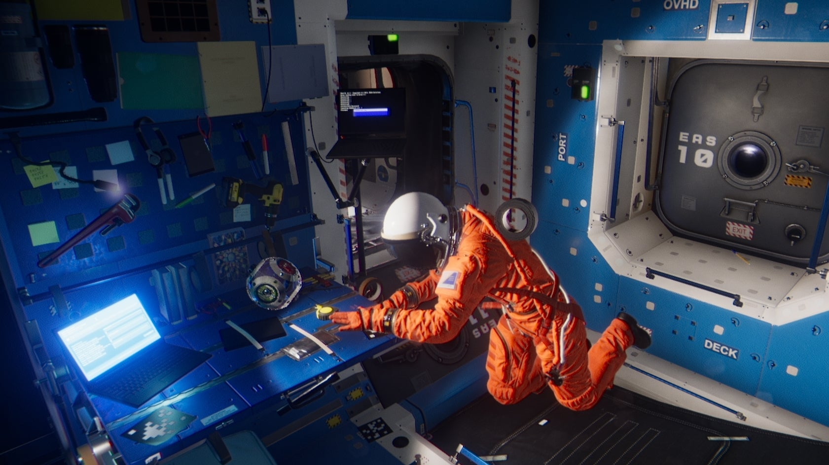 That means you view everything from cameras placed around the station, switching viewing angles to try and get a hold on the space. Then you’re inside a floating sphere – both inside and outside the station – bobbing around in zero gravity, not knowing which way is up. It certainly feels authentically like you’re in space, but the accompanying motion sickness is maybe a step too far.